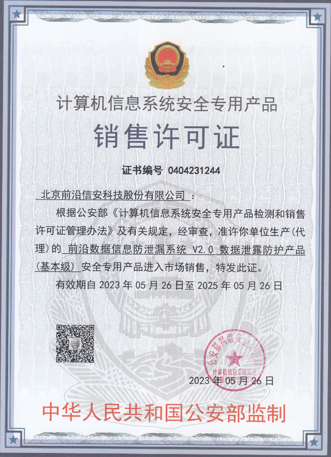 计算机信息系统安全专用产品销售许可证--前沿数据防泄漏系统